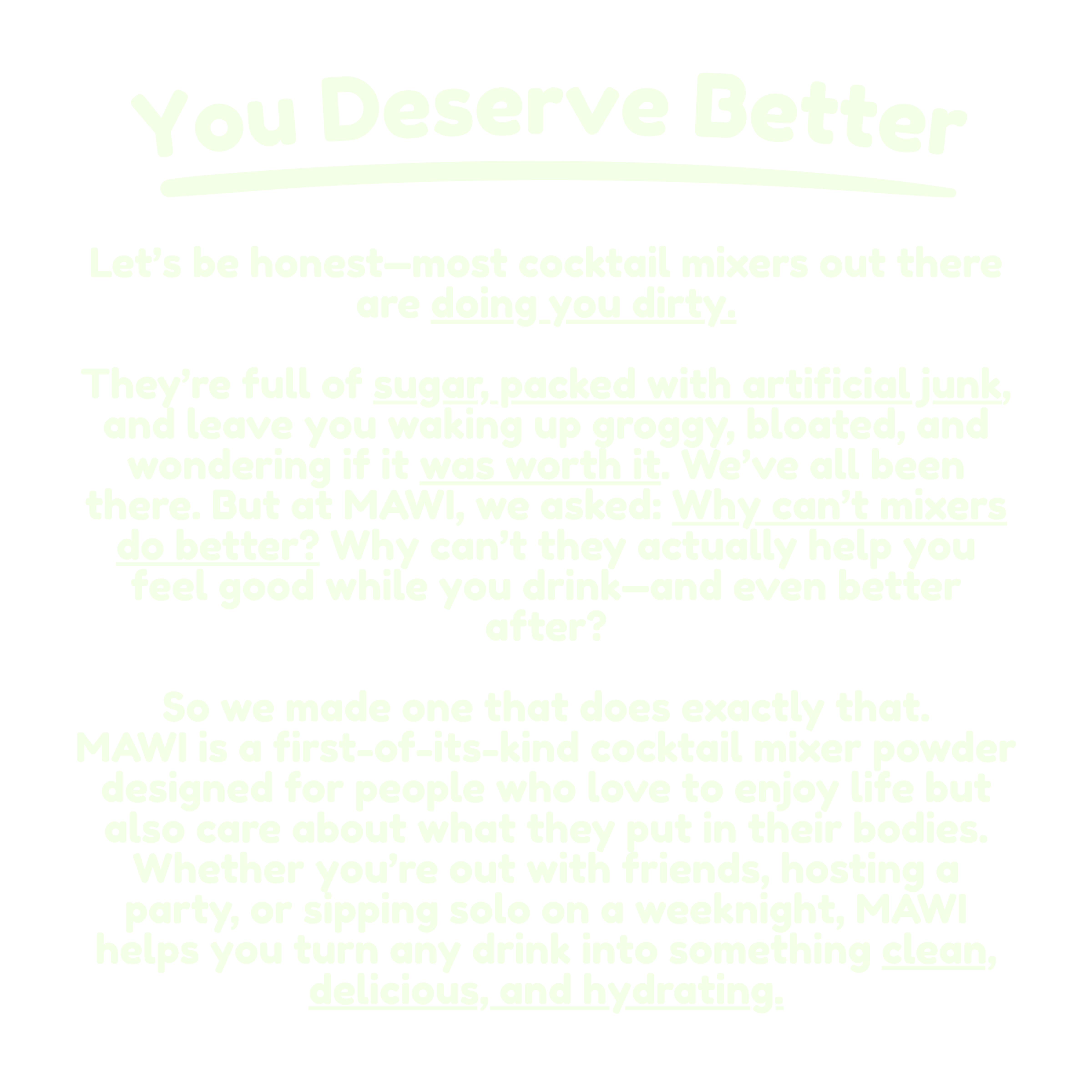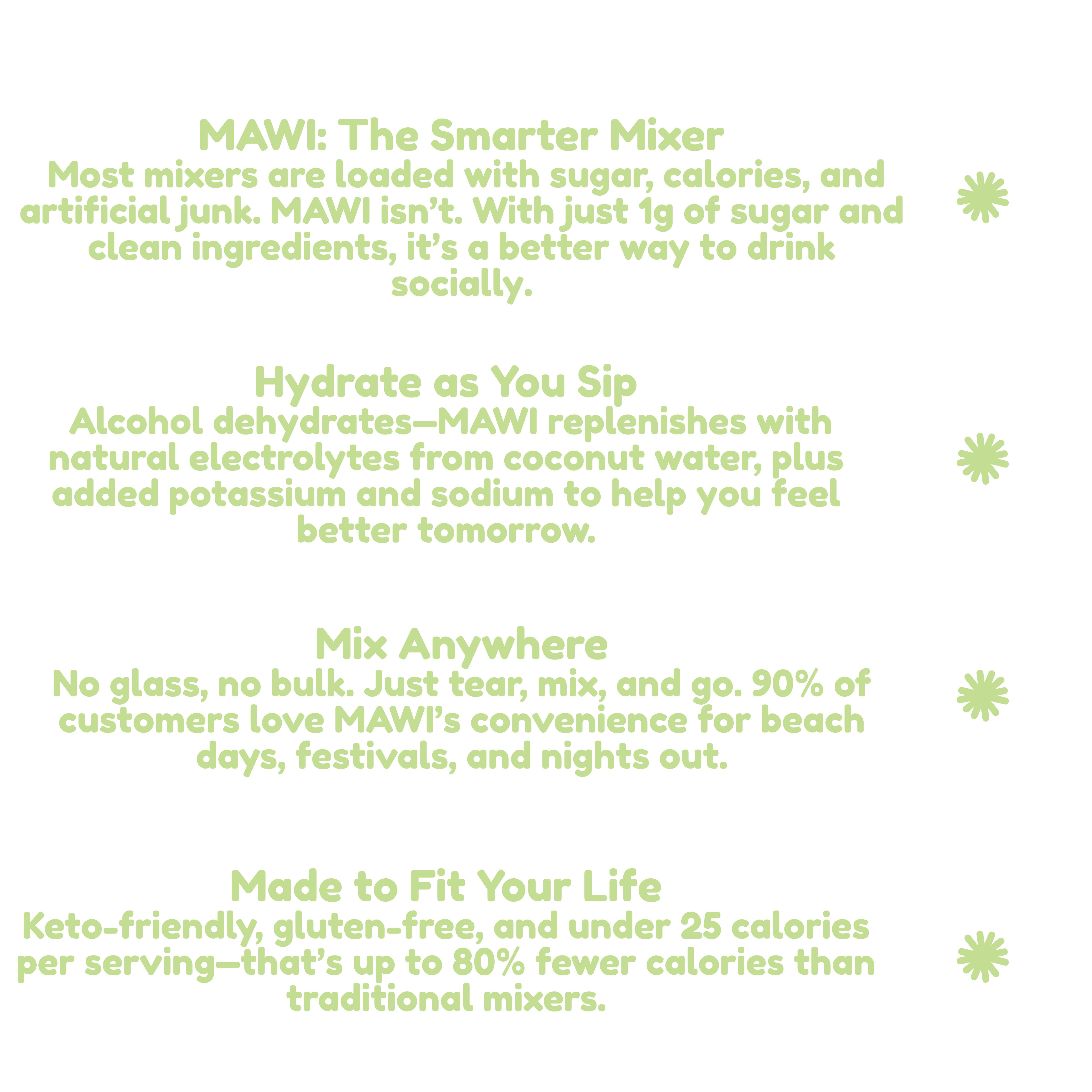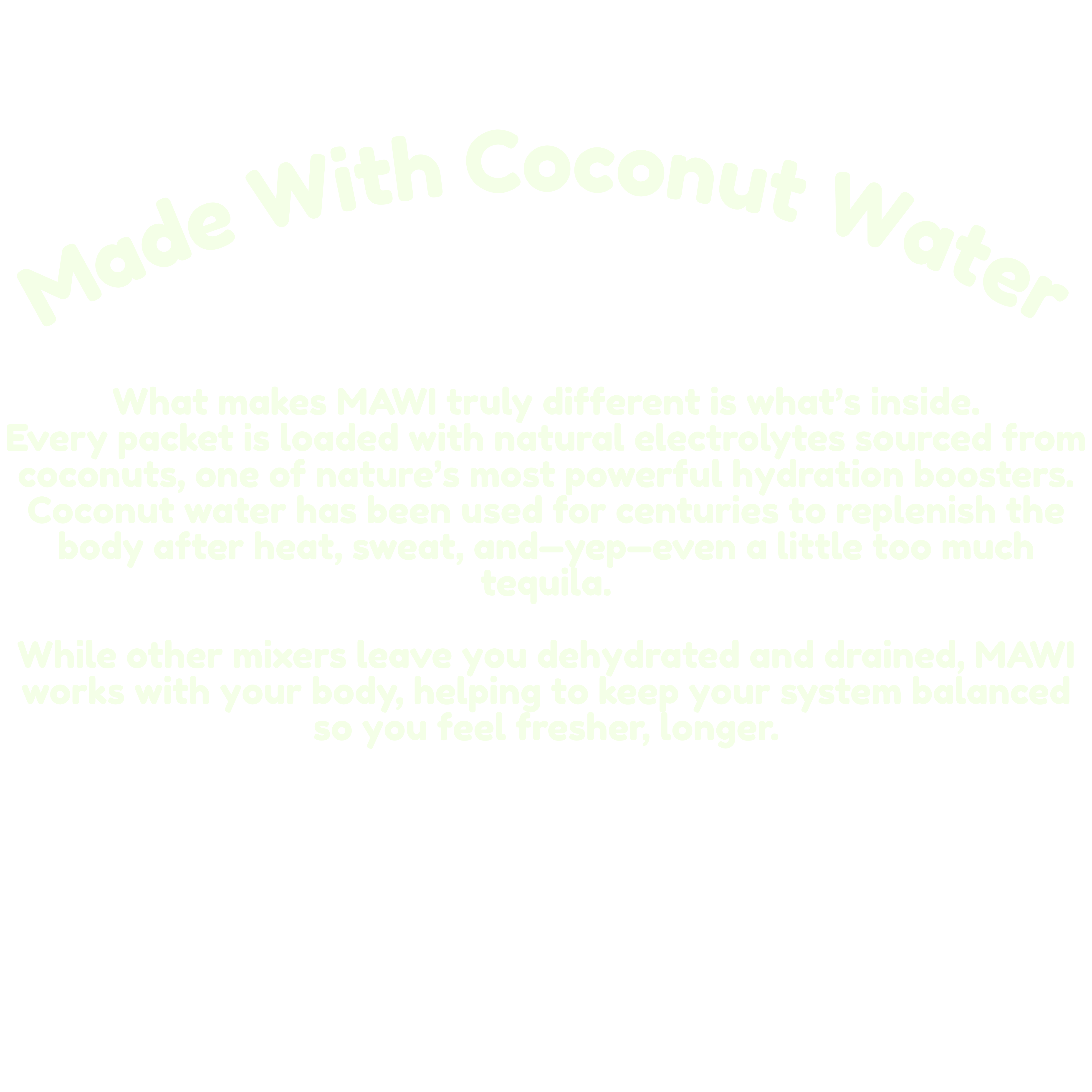 You shouldn’t have to sacrifice your body to have a good time. MAWI was built for the modern drinker—someone who wants to feel good, look good, and have a blast doing it. Whether you're on a boat, at a beach resort, or dancing in your living room, MAWI is the perfect plus-one.